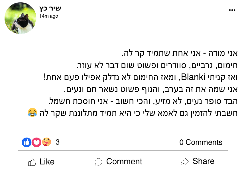 "זה מחמם ברמות! הייתי בטוחה שהבד יהיה קצת יותר דק אבל הוא ממש מחמם"
